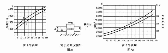A2 具體內(nèi)容:圖A1 用于“A 系列管夾”;圖A2 用于“B 系列Ⅰ型管夾”。a 曲線表示管夾與管子處于“靜摩擦狀態(tài)”時,管子外徑尺寸與管夾承受管子軸向力的函數(shù)關(guān)系。b曲線表示管夾與管子處于“動摩擦狀態(tài)”時,管子外徑尺寸與管夾承受管子軸向力及轉(zhuǎn)矩的函數(shù)關(guān)系。