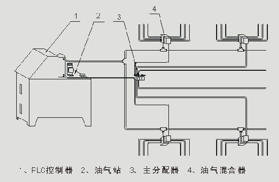 遞進(jìn)式油氣潤(rùn)滑系統(tǒng)由油氣站、PLC控制、主分配器、油氣混合器組成。系統(tǒng)工作時(shí),氣動(dòng)泵或電動(dòng)泵把油輸入主分配器,主分配器把油分成若干部分后輸入油氣混合器,通過(guò)混合器使壓縮空氣將油送到潤(rùn)滑部位。