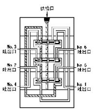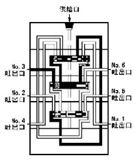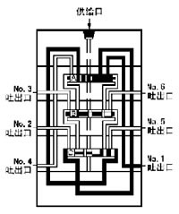 5、流入的潤滑劑推動活塞C向右移動、右腔的潤滑劑壓向NO.4吐出口經外部配管送向潤滑點。當活塞C運動至右極限時活塞B左腔開始進入潤滑劑。