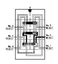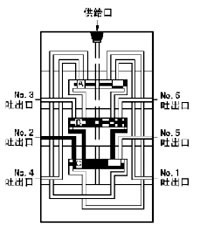 6、流入的潤滑劑推動活塞B向右運動、右腔的潤滑劑壓向NO.5吐出口,經外部配管送向潤滑點。當活塞B移動到至右極限時活塞A左腔開始進入潤滑劑。