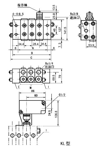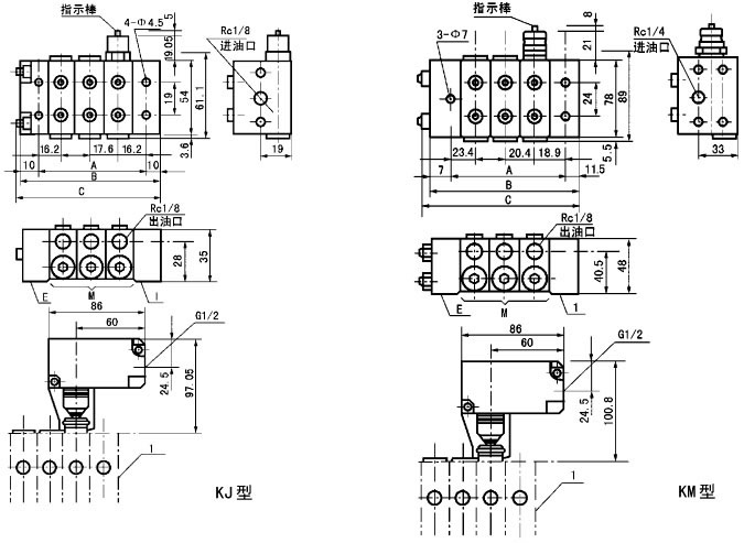 一、概述 KJ、KM、KL系列單線遞進式分配器,適用于潤滑點密集、耗脂量不同,給油頻繁單線集中潤滑系統中,組成子母式分配系統實現分區控制進行潤滑的場合。 KJ、KM、KL系列單線遞進式分配器,它由中碳合金結構鋼制造的供給體、端部體和3~8片根據設計需要所確定的給油量和出油口數的中間體組合而成。分配器的正常出口設置于分配器的兩側面,在上面還設置有預備出口,各中間體的出油口內均裝有止回閥,能徹底防止因潤滑點背壓作用而產生潤滑脂的逆流,保證了各出油口的給油量定量、準確。