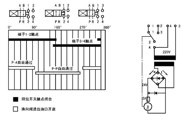 | 四、工作原理 該閥主要由直流電機、限位開關、換向閥體,整流變壓器裝置等元件安裝于同一底板上并置于防護罩殼內組成。 系統中的電控箱發出換向信號(系統末端壓差開關發出)使直流電機作旋轉運動,并通過偏心輪帶動閥芯作直線往復運動。當閥芯從原位到達所需要的換向位置時,閥芯端部的擋板觸動限位開關動作,發出電信號至電控箱,責令直流電機停止旋轉,完成了換向過程。 | |||||||||||||||