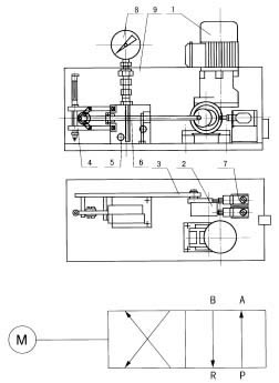 三、 工作原理 EM型電動(dòng)換向閥主要由電動(dòng)機(jī),減速機(jī)構(gòu),偏心連桿機(jī)構(gòu),強(qiáng)簧機(jī)構(gòu),二位四通閥,限位開關(guān),壓力表等組成。 電動(dòng)機(jī)經(jīng)蝸輪蝸桿減速后,由偏心輪2帶動(dòng)連桿3 作直線往復(fù)運(yùn)動(dòng)。由于連桿末端所連動(dòng)的彈簧機(jī)構(gòu)4的作用,使二位四通閥5中的滑芯桿6產(chǎn)生急速的推拉動(dòng)作,從而改變二位四通閥各油口的聯(lián)接方式,達(dá)到液流換向的目的。此時(shí),偏心輪旋轉(zhuǎn)了180°到達(dá)另一個(gè)死點(diǎn)位置,觸動(dòng)了限位開關(guān)7。限位開關(guān)即可送出脈沖信號(hào),停止閥電機(jī)運(yùn)行,完成了一個(gè)工作過程。壓力表8裝于防護(hù)罩9頂部用于監(jiān)視閥內(nèi)的工作壓力。