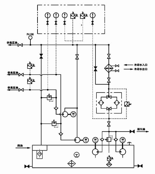 雙高壓高(低)壓稀油站的主要特點為一套稀油站有二根高壓輸出管道,可滿足二個高壓潤滑點的需要,其他和普通高(低)壓稀油站相同。 每根高壓輸出管道均有壓力表和壓力控制器,以便控制每根高壓管道的壓力及觀察工況。 本產品組成部分也和普通高(低)壓稀油站相同;僅比它多一臺高壓油泵,二臺高壓油泵的吸口均聯于低壓泵的供油口;二臺高壓泵均啟動時,要從低壓供油口吸走5L/min的潤滑油,對低壓泵流量較小者,啟動高壓泵時低壓供油壓力可能會有所降低,對潤滑油均供向同一軸承的系統來說,軸承的潤滑油總量并未減少,不會影響對軸承的潤滑;但啟動高壓泵時,低壓壓力的降低可能造成備用低壓泵會臨時啟動,這種情況也不致影響潤滑系統的正常工作;但采用二低壓泵互相切換的備用工作方式時,可能工作泵停止后,備用泵流量仍不滿足要求時就不能使潤滑系統正常工作了;故選用較小流量低壓泵時應注意這一情況。 |